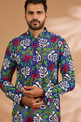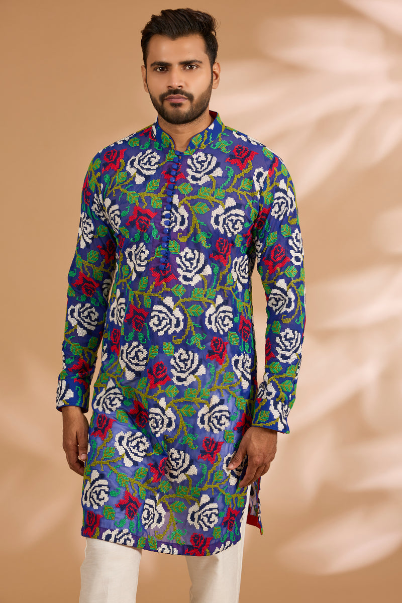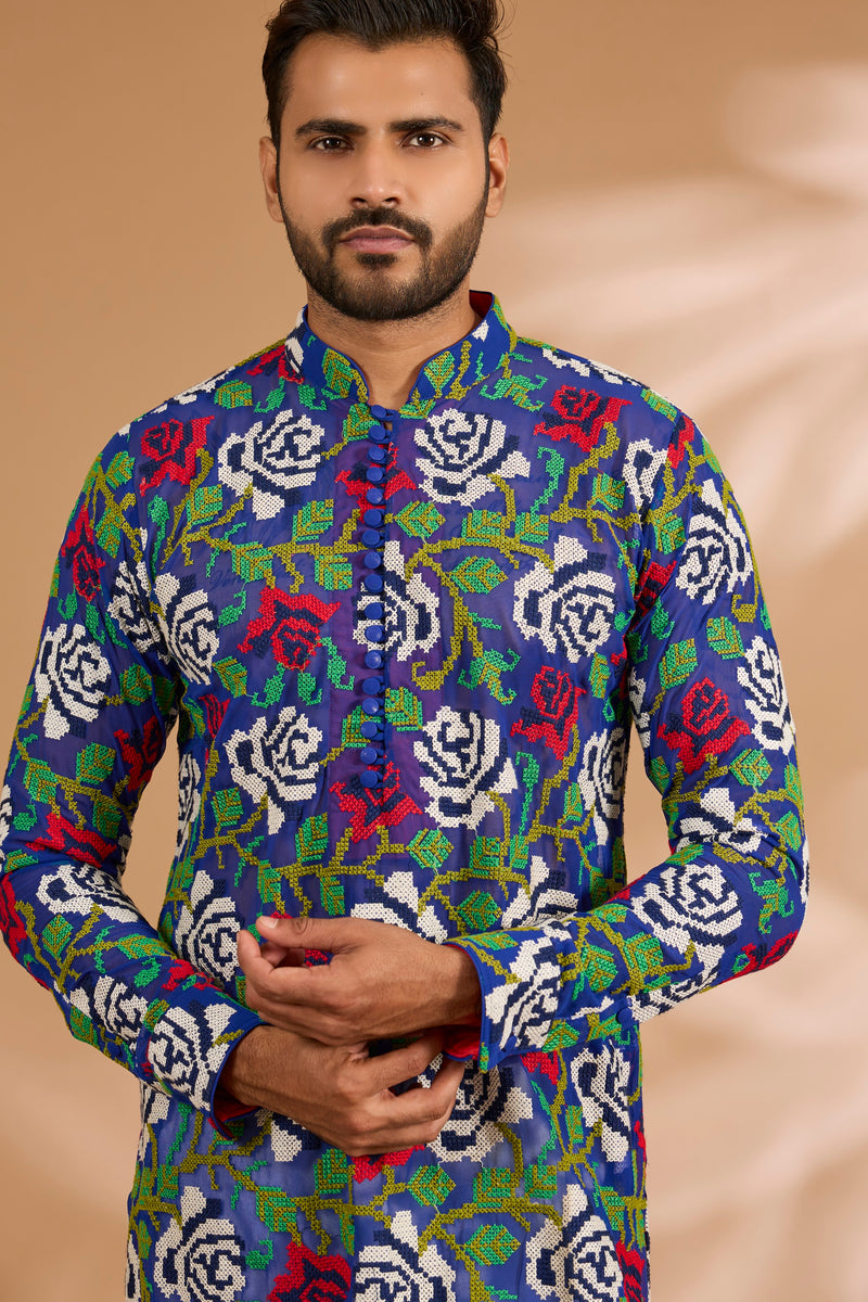 INDIGO BLUE GOREGTTE W MULTI COLOUR THREAD JAAL UNLINED LOOP BUTTON KURTA W PRINT DETAILING W COTTON SILK PANT
