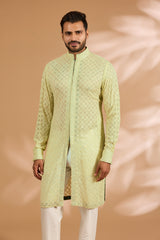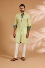 LIME GREEN GOREGTTE SEQUIN+THREAD JAAL UNLINED FRONT OPEN KURTA W PRINT DETAILING W COTTON SILK PANT